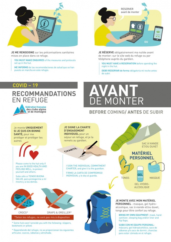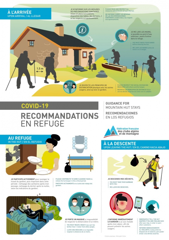 A l’instar des recommandations élaborées pour la reprise des activités de montagne, la FFCAM a conçu des fiches illustrées exposant les bonnes pratiques à retenir pour séjourner en refuge en toute sécurité.
