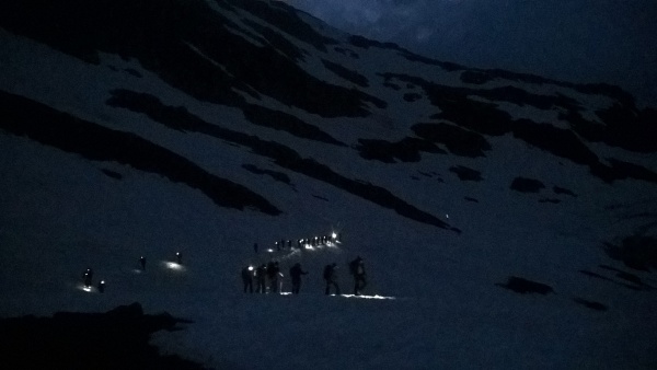 C'était aussi l'occasion pour les jeunes et moins jeunes débutants (es) de se confronter avec un mélange d'enthousiasme, de curiosité et un peu d'inquiétude aux difficultés d'une ascension matinale en terrain parfois hostile (neige, glacier, pentes longues et raides)