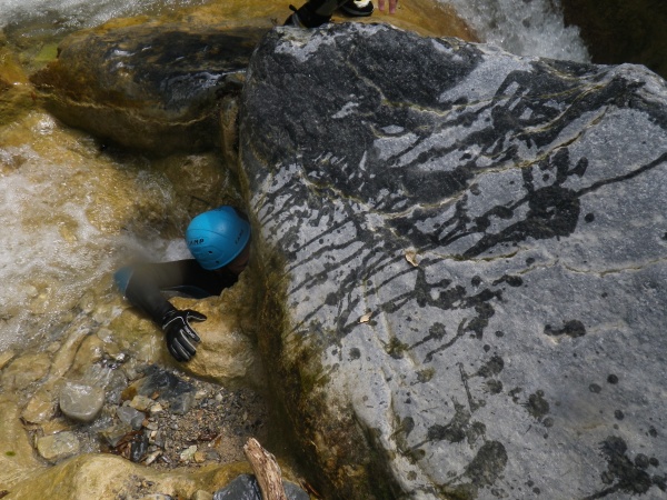 1er jour, départ de Bron à 6h00 pour plusieurs heures de route : nous prenons la direction de la vallée de la Vésubie et le village d'Utelle pour faire le canyon d'Imberguet. Nous descendons ce canyon sous un temps magnifique. Malgré le manque d'eau, ce canyon permet de se mettre en jambe tranquillement et d'expliquer les bases du canyoning aux débutants. Après 3h de descente nous arrivons à la confluence avec la Vésubie.
