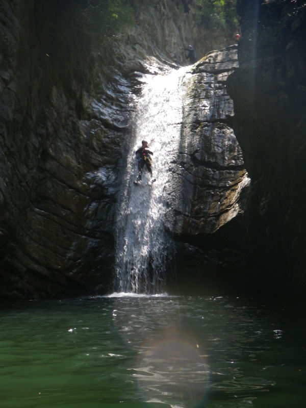 Nous nous embarquons dans le canyon de la Bollène pour ce 3ème jour. Comme la veille, nous enchaînons les obstacles dans des conditions idéales, l'eau est fraîche mais les quelques rayons de soleils qui nous parviennent sont très agréables. Le passage clé du canyon : une succession de deux grands toboggans que tout le groupe descend avec facilité et sensation !
