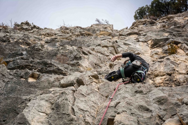 Les plus aguerris grimpent en tête poser les moulinettes pour les suivants. On choisit ensuite sa voie et on grimpe avec plus ou moins de grâce. Pour ceux qui n’ont pas l’habitude de l’extérieur, ça change de la salle ! Pas de voies faciles pour s’échauffer (ça commence dans le 5b), qu’à cela ne tienne on fera avec. La première voie est tout de même difficile, le froid se fait sentir, les doigts n’apprécient pas, il est compliqué de bien sentir le rocher dans ces conditions et de trouver des prises de main.