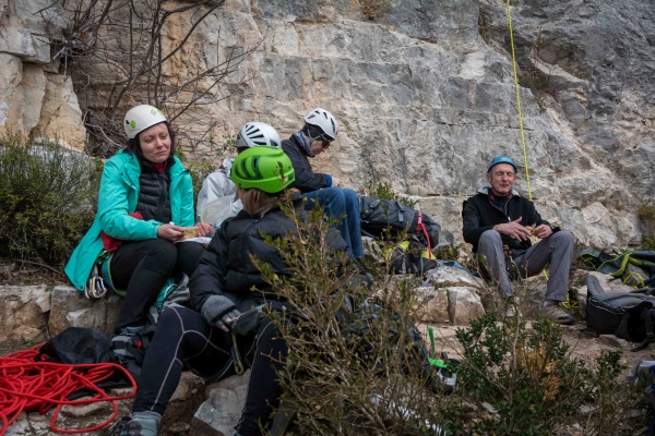 Après un arrêt café/chocolat pour requinquer les troupes à l’arrivée et faire connaissance, il est temps de mettre le cap sur notre site de grimpe du jour. En haut, les encadrants forment les groupes, et c’est parti pour une journée de grimpe sur un très beau site. En plus la chance semble être de notre côté, il ferait (presque) beau !