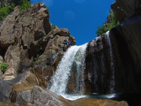 1er jour, départ de Bron à 6h30 direction le barrage de Villefort et les gorges du Chassezac. Arrivée au parking, encore peu de véhicules, mais ça ne va pas durer longtemps : ce canyon est très prisé des professionnels de la région ! Heureusement nous arriverons à trouver un peu de solitude après le passage de la Rajolle, les guides effectuant uniquement la première partie. Nous descendons ce canyon sous un temps magnifique, le soleil chauffe les blocs de granit mais heureusement l’eau est là pour nous rafraichir. Nous enchainons petits toboggans, rappels de 10m maximum, sauts optionnels et le très beau passage de la Rajolle en opposition. Après 5 heures de descente, nous remontons un sentier bien raide en 1 heure pour revenir aux voitures et direction le gite où un petit apéro nous attend !