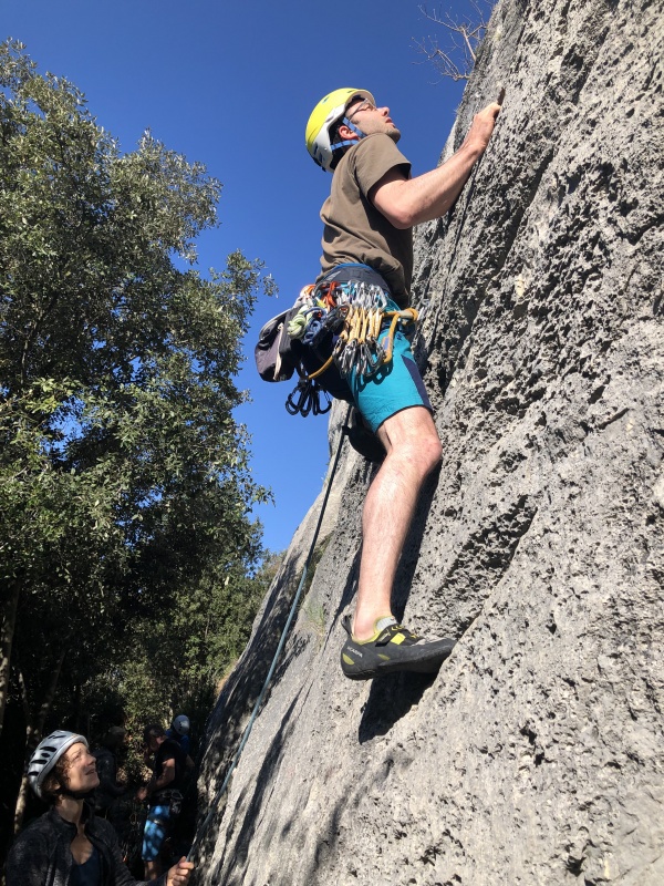 Bonne reprise le samedi, dans le secteur La bête, où nous retrouvons les joies de la lecture de voie et des prises de main abrasives. Alain n’entend pas les conseils avisés de Christophe et part dans « En Seynes l’artiste » 6a où il se heurte à la dalle finale, aux points bien trop espacés pour grimper sereinement ! Myriam clippe une dégaine magique dans une position improbable, en croisant sous le bras : spectacle surréaliste qui nous fait frissonner d’en bas. Pour passer « Senteur vanille » 6c, Anouk hisse une perche avec sa corde et découvre son fonctionnement en situation réelle.