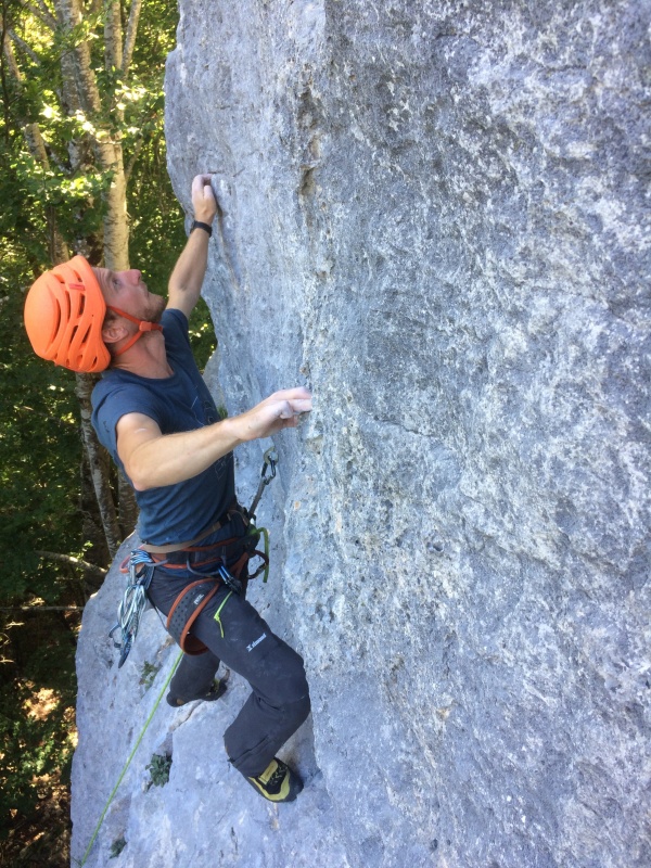 Le secteur de la Goulandière, plus haut dans la même vallée, élève un peu le niveau, d'autant que nous ne sommes pas les seuls à chercher un secteur qui passe à l'ombre l'après midi. Là encore, la plupart des voies sont bien tracées et suivent intelligemment les faiblesses du rocher, quitte à louvoyer un peu. Deux voies utilisent même des arbres : "Déchaîne toi" 6B et "Hêtre ou ne pas être" 6A, vous aurez reconnu de quels arbres il s'agit. "Alpha 5" est très demandée, c'est une voie de chauffe en 5C dans un dièdre. Avec une corde de 70m, si on est joueur on peut faire les deux longueurs de "Opus 1" 6B ou "Bières frite maillot" 6B en moulinette (on oublie pas le noeud au bout de la corde !). Benjamin sort les crocs et monte la corde dans "Sanctuaire" 7A+, ce qui permettra aux derniers énervés de finir leur stock de glycogène en moulinette... On arrête avant la blessure, et on partage un goûter sucré/salé/non alcoolisé avant de reprendre la route. Puis on part en balade sur la route des Ecouges, ha pardon c'était un raccourci ! Transition en douceur pour finir ce beau week end. Au final, qu'est ce qu'on attend de ce cycle autonomie ? Que les prochaines sorties soient aussi bien !