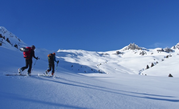 La crête qui mène à la Croix de Sécheron est bien soufflée, une légère corniche s'est formée, elle domine les pentes S, SE et E. Nous la suivons après la pause déjeuner, jusqu'au point 2171. De là, nous enlevons les peaux et passons en mode ski, "demi-ski" pour Benjamin qui casse une de ses fixations en chaussant (merci pour lui à la sangle de Sylvain qui lui aura permis, tout au long du week-end, de goûter à cette délicieuse poudreuse AOP Beaufortain). Nous effectuons quelques belles courbes jusque sous le chalet du Sécheron de Feissons. Puis nous remettons les peaux, direction le chalet de la Perrière.