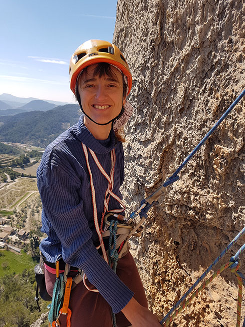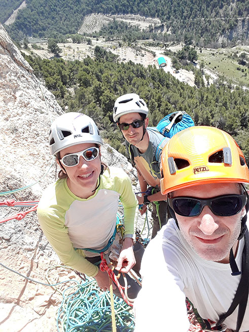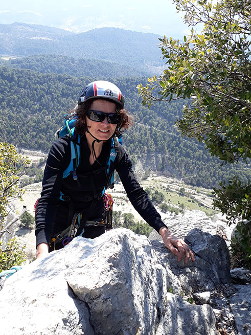 Nadine au relais. C'est d'ailleurs le seul moment ou il est possible de prendre Nadine en photo, tant son allure en paroi est vive.