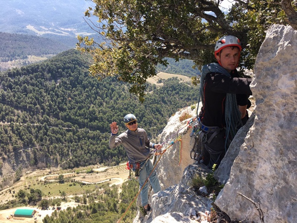 Benjamin dans la première longueur du "Gastronome", un 8b un peu patiné a cause de sa grande fréquentation (le niveau monte, c'est fou !). Mathilde lui garantit un assurage vigilant.