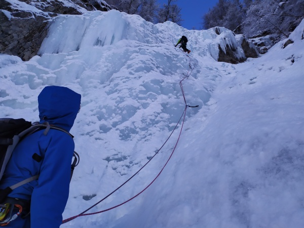 Bonne surprise, il ne neige plus, il fait beau, les cascades sont en bonnes conditions ! Le redoux est passé par là et ça se voit. Ca coule un peu mais ça passe bien partout.