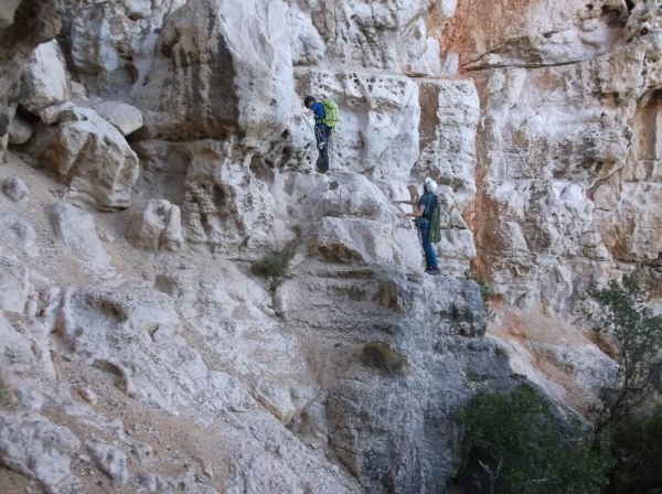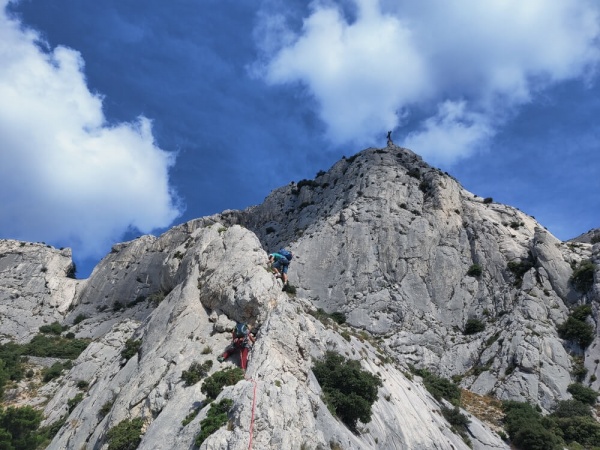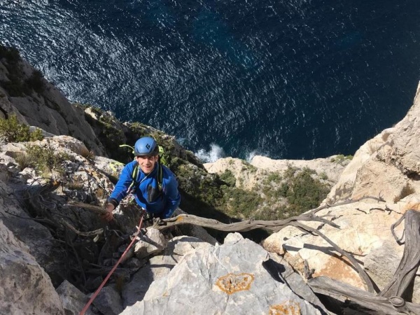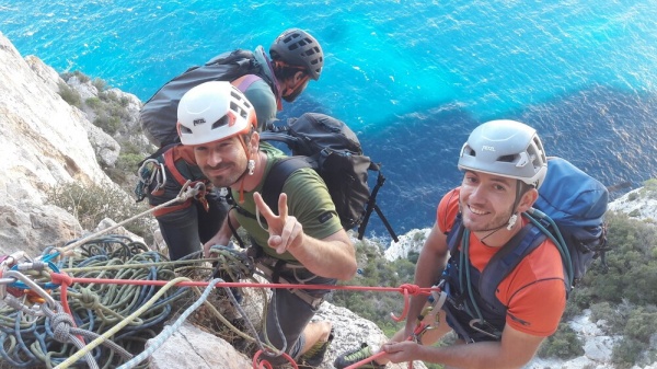Pour ce deuxième jour, direction la calanque d’En Vau ! Après une approche fort sympathique au milieu des pins, puis un rappel de toute beauté par le “Trou du Canon”, nous entamons la Traversée Ramond. Comme Guillaume (notre GHM) n’était clairement pas venu ici pour faire une promenade dominicale, nous bifurquons à mi-chemin et nous nous séparons en deux groupes pour nous élancer à l’assaut de la Cheminée Ben-Hur et des Testicules Rampants. Le moins que l’on puisse dire c’est que le TD P4 (cotation de sérieux et d'équipement, NDLR) sur du rocher qui s’émiette en chips, ça fait pas rire la Bonne Mère…