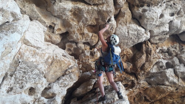 Maëlle au départ des Testicules Rampants, un 6a légèrement deversant
