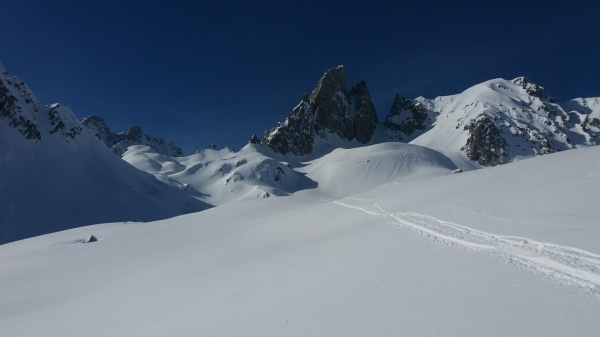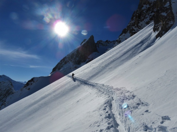 Après avoir quitté la centaine de personnes croisées sur l'autoroute du du Rognolet constituant les 500 premiers mètres de dénivelé, une bifurcation heureuse nous amène dans le monde du silence, de la grosse poudre vierge bien profonde. Heureusement une trace de vendredi nous facilite bien la progression