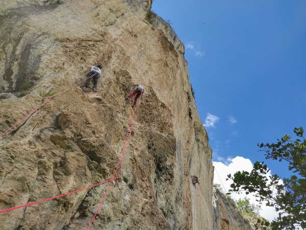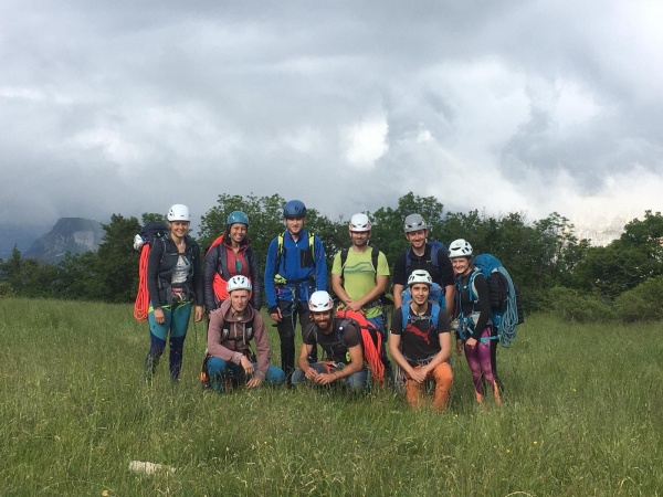 Nous avons commencé la journée par monter tout notre barda au pied de la vire qui fera office de chambre à coucher. Après une rapide présentation de toute l’équipe, nous sommes rapidement entré.e.s dans le vif du sujet :