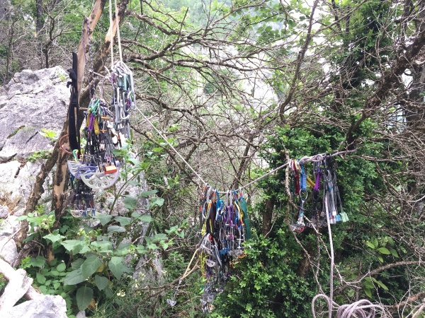 On peut dire merci à nos trois encadrants Charly, Romain, et notre guide Guillaume, de nous avoir soutenus et apportés tout le matériel nécessaire, car les pauvres ils en ont fait des allers-retours pour nous passer du matériel via notre corde de matériel ! En artif, on grimpe avec une corde "de contact" qui permet au grimpeur de se faire envoyer le matériel dont il a besoin par son assureur. Le matériel est tellement varié que ça évite de partir avec 20kg de quincaillerie.