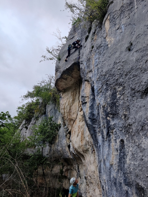 Suite à la démonstration, tout le monde s’élance, se familiarise avec le matériel, les techniques et se surpasse (à tel point que quelques cris nous échappent…;) ) ! Quand on est tendu sur les derniers barreaux de notre étrier, soutenu par un crochet, notre fifi et les bras en l'air en train de taper un piton, ça fait peur, surtout quand le spit est bien bas sous nos pieds….! Finalement, qu’est ce que c’est bon d’arriver en haut et de se dire “en fait je t’aime mon fifi” !