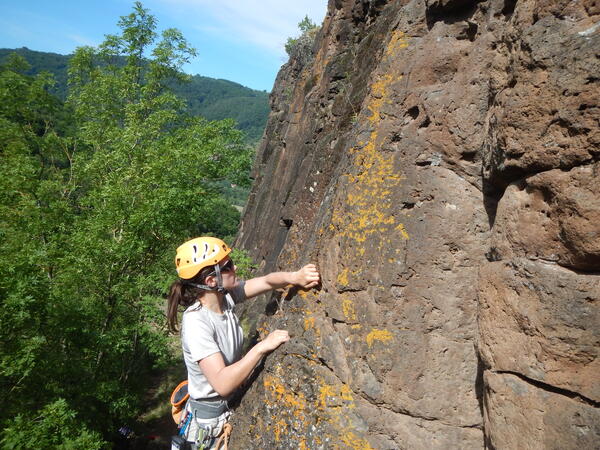 Lors des précédentes sorties ESCALADE en HAUTE LOIRE, l'altitude (environ 1000/ 1500m) nous garantissait en été, une température supportable par rapport à notre région. Nous avons eu chaud comme à Lyon, mais en partant de bonne heure (7h), on pouvait grimper jusqu'à 14h, même 16h, grâce à un vent frais d'altitude. Il fallait néanmoins se protéger les parties du corps découvertes pour ne pas prendre de coups de soleil. On a aussi pu tester au retour la piscine pour se détendre.