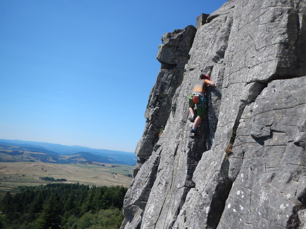 Deux nouveaux sites, les orgues basaltiques, site de PRADEL avec l'Allier en dessous et le rocher TOURTE (à 1500 m en face du Mézenc) étaient au programme. Le premier, comme me l'a dit un cafiste lyonnais rencontré ce jour- là, il faut déconnecter le cerveau pour aller chercher les points !!!. Celui du rocher Tourte, phonolite , équipement plus moderne, donc moins engagé a permis de faire une bonne journée avec de belles longueurs (25 m).