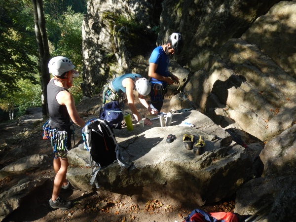 La chaleur, elle était là jusqu'à 11 heure (EST), mais sous la canopée de la forêt et le soleil plus au SUD, nous avons pu pratiquer jusqu'à 16 heures. Une piqûre de guêpe au niveau de la tête sans conséquence car assurage au grigris et en moulinette à cet instant- là. La personne a tout lâché d'un coup. Le dard et la poche à venin ont été retirés tout de suite. Les relais ne sont pas tous chainés. Une boisson gazeuse sucrée fraîche et un dessert ont été les bienvenus pour clôturer cette journée. F.PAILLIER