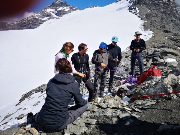 WE dernier passé en vanoise au barrage du Saut avec barbecue en commun. Après une nuit fraiche, l ascension débute à 6h30, 1500m de dénivelé pour arriver au sommet à 11h (Nicolas veille au grain!)Sommet 3747m dégagé temps magnifique!  Au retour, en avance sur le timing, Alexandre nous a rappelé quelques notions sur les encordements ,les noeuds ...aux abords du glacier.