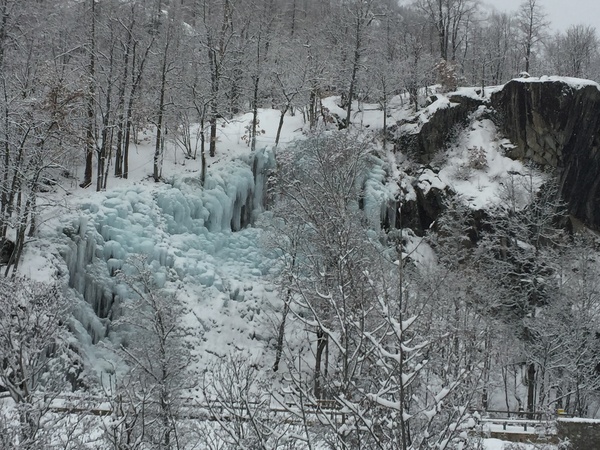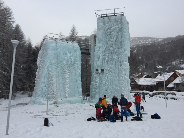 Le lendemain matin, nous nous réveillons sous la neige. Aujourd’hui, nous avons rendez-vous à Freissinières au pied de la toute nouvelle Tour de glace. Sur place 2 guides (Sylvain et Louis) nous attendent. Ils ont déjà équipé les voies en moulinette. Après une brève revue du matériel, nous nous équipons et attaquons les différents murs englacés de la tour. Au choix : une structure de 12 mètres avec une légère inclinaison sur 3 de ses 4 faces ou une structure de 18 mètres à la verticale englacée sur 3 de ses faces.