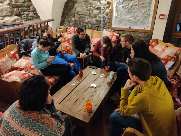De retour au gîte, l’attente du repas s’est faite autour d’une boisson chaude, autour de discussions ou d’ateliers manipulation de cordes et rappels de nœuds : cabestan, demi-cabestan ou pose de relais.