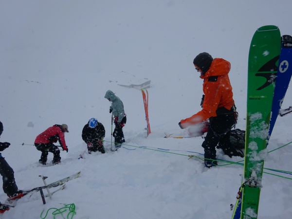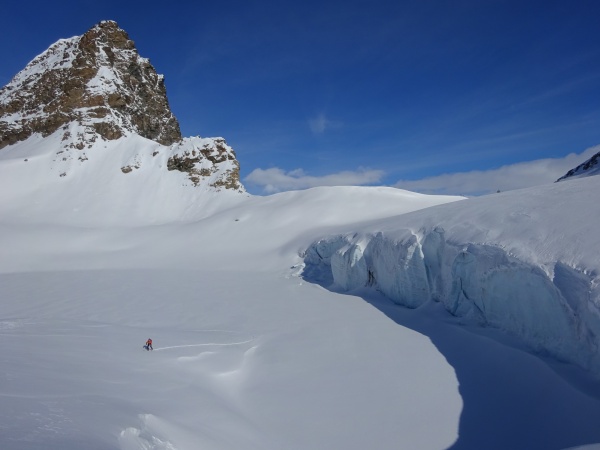 Le lendemain, la météo devient clémente, -9°C devant le refuge. La montée vers la pointe Tonini permet au groupe de se familiariser avec les caprices de la nivologie. But signé, 50 mètres sous le col !