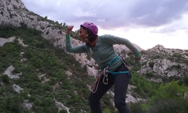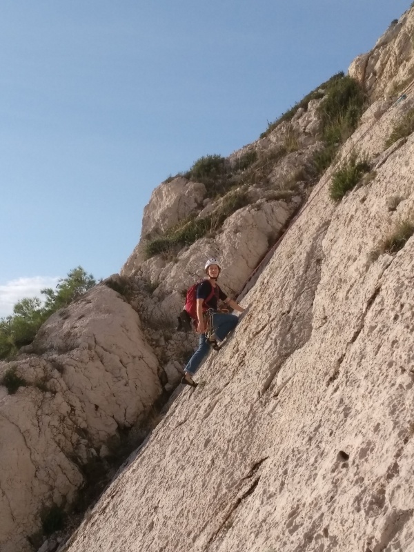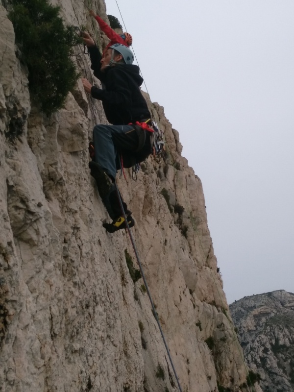 Dimanche, une équipe réduite de 4 personnes se régale dans un monument : l'arête de l’extrême bec de Sormiou. Lorsque le chemin de rando s'arrête au bout du bec, les grimpeurs descendent dans une petite crique (bas du secteur Antécime) et mettent leurs chaussons... Ou leurs bottes, parce que quand on arrive dans la grotte, ça dérape dans la gadoue ! Et quelle ambiance : un trou d'eau d'où jaillissent des gerbes d'écume, des parois sombres et luisantes d'humidité, et une lumière stellaire tout en haut. Guilhem fonce tête baissée à droite, il trouve quelques points historiques, puis plus rien... Faut il s'engager sur la vire boueuse non protégée ? Non, car Alain repère sur la face gauche la voie normale, bien plus raisonnable, même mouillée ! En ressortant de la grotte, Guilhem récupère le portable de Myriam, mais perd son descendeur en sortie du petit rappel de 10m, plouf dans l'eau (merci Alain pour le descendeur de secours). S'ensuit une traversée sans histoires, puis une remontée magique sur l'arête. La première longueur est du 4C "Calanques" : un bon 5C, si on compte le vent de travers, les prises arrondies et les problématiques de clippage (rallonger ou pas un point, redescendre déclipper un point pour réduire le tirage). Pas le temps de jouer dans les voies de la Tiragne-Bec accessibles par la vire intermédiaire, nous sortons par le haut et retrouvons le col de Luï d'Aï via une traversée d'arête hors sentier. Reste plus qu'à rentrer à pied jusqu'à la barrière de Sormiou, puis retour à Lyon.