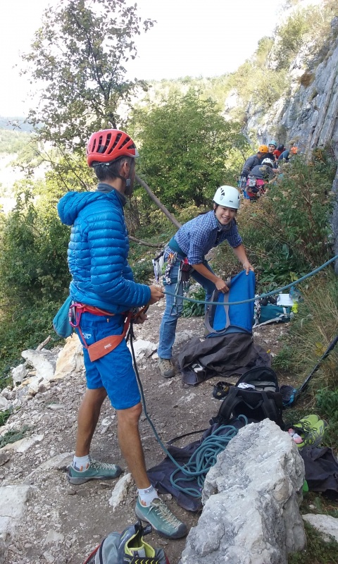 Le secteur de la Goulandière, plus haut dans la même vallée, élève un peu le niveau, d'autant que nous ne sommes pas les seuls à chercher un secteur qui passe à l'ombre l'après midi. Là encore, la plupart des voies sont bien tracées et suivent intelligemment les faiblesses du rocher, quitte à louvoyer un peu. Deux voies utilisent même des arbres : "Déchaîne toi" 6B et "Hêtre ou ne pas être" 6A, vous aurez reconnu de quels arbres il s'agit. "Alpha 5" est très demandée, c'est une voie de chauffe en 5C dans un dièdre. Avec une corde de 70m, si on est joueur on peut faire les deux longueurs de "Opus 1" 6B ou "Bières frite maillot" 6B en moulinette (on oublie pas le noeud au bout de la corde !). Benjamin sort les crocs et monte la corde dans "Sanctuaire" 7A+, ce qui permettra aux derniers énervés de finir leur stock de glycogène en moulinette... On arrête avant la blessure, et on partage un goûter sucré/salé/non alcoolisé avant de reprendre la route. Puis on part en balade sur la route des Ecouges, ha pardon c'était un raccourci ! Transition en douceur pour finir ce beau week end. Au final, qu'est ce qu'on attend de ce cycle autonomie ? Que les prochaines sorties soient aussi bien !