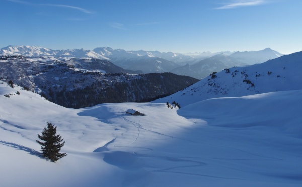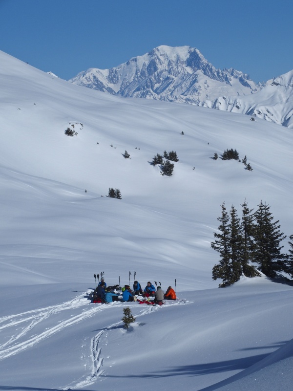 A la sortie de la forêt, la vue se dégage sur les massifs environnants, de l'Est du Beaufortain à la Lauzière et derrière encore le Mont Blanc et les sommets de Vanoise. Et nous contemplons ces immenses champs de neige scintillante, vierges de toutes traces, qui s'étendent sous la Croix de Sécheron. Il est déjà presque 13h et nous décidons de pique-niquer sous le point 2070, avant le col de Sécheron, avec vue sur la suite de notre itinéraire.