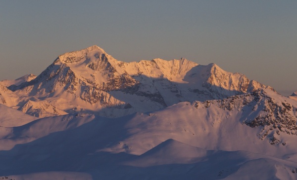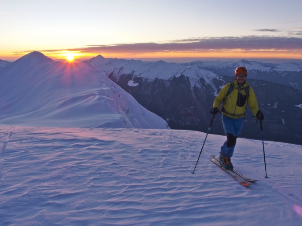 La montée jusqu'au sommet, par le côté Ouest, se fait, soleil déclinant, par d’esthétiques vallonnements vierges de toutes traces. Quel plaisir d'avancer dans ces étendues, à ce moment de la journée. Le soleil se couche quand nous arrivons sur la crête. Et la lune sort au même moment, elle est presque pleine, elle nous offrira une luminosité satisfaisant pour la descente, côte Est de la Grande Pointe cette fois-ci.