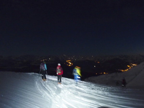 Nous allumons nos frontales et nous délectons des 20 à 30 cm de poudreuse, reposant sur un fond portant, jusqu'au chalet de la Perrière. Quelle expérience pour le groupe que cette descente sous la quasi pleine lune... Un moment rare dans le plus pur esprit Nature, que seule l'ambiance du soir dans le chalet parviendra à surpasser (malgré les -6°C dans le dortoir tout au long de la nuit).