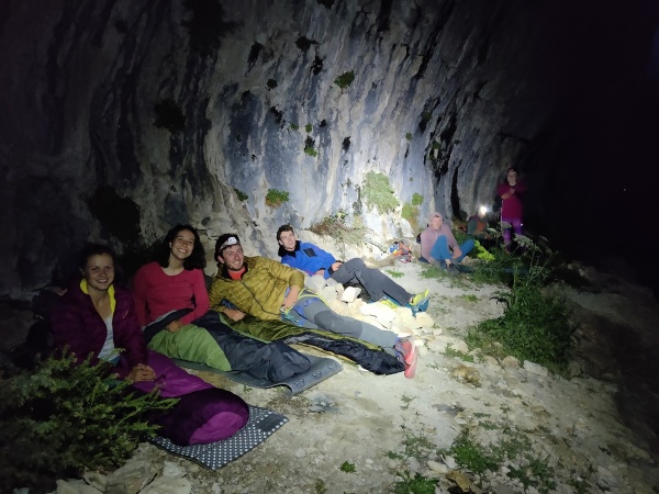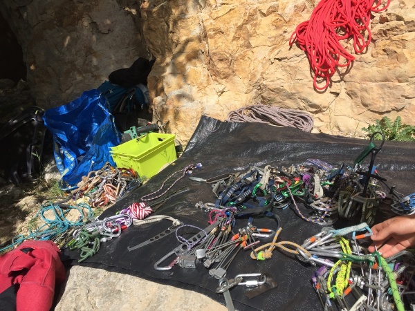 Nous avons commencé la journée par monter tout notre barda au pied de la vire qui fera office de chambre à coucher. Après une rapide présentation de toute l’équipe, nous sommes rapidement entré.e.s dans le vif du sujet :
