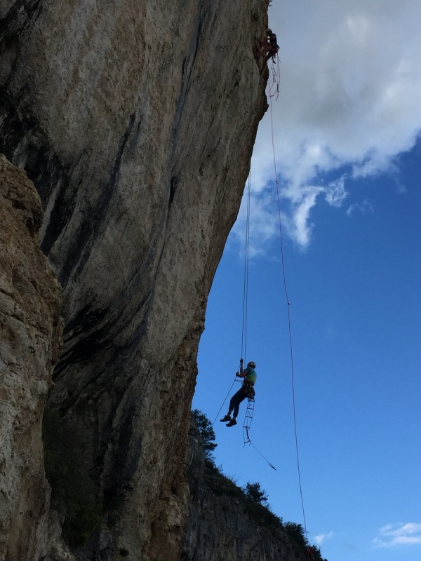 Suite à la démonstration, tout le monde s’élance, se familiarise avec le matériel, les techniques et se surpasse (à tel point que quelques cris nous échappent…;) ) ! Quand on est tendu sur les derniers barreaux de notre étrier, soutenu par un crochet, notre fifi et les bras en l'air en train de taper un piton, ça fait peur, surtout quand le spit est bien bas sous nos pieds….! Finalement, qu’est ce que c’est bon d’arriver en haut et de se dire “en fait je t’aime mon fifi” !