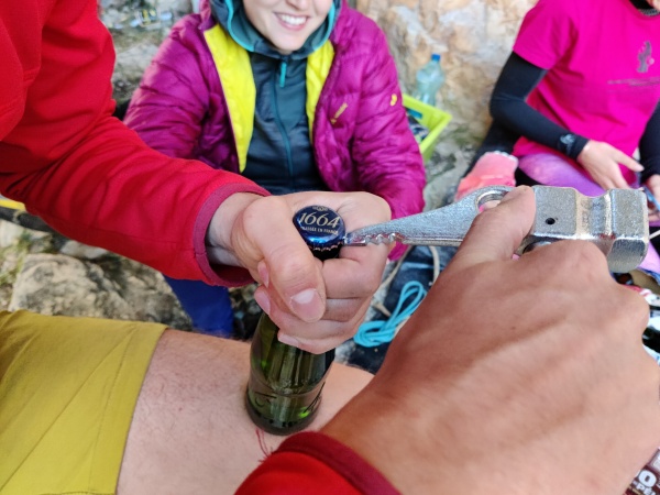 On peut dire merci à nos trois encadrants Charly, Romain, et notre guide Guillaume, de nous avoir soutenus et apportés tout le matériel nécessaire, car les pauvres ils en ont fait des allers-retours pour nous passer du matériel via notre corde de matériel ! En artif, on grimpe avec une corde "de contact" qui permet au grimpeur de se faire envoyer le matériel dont il a besoin par son assureur. Le matériel est tellement varié que ça évite de partir avec 20kg de quincaillerie.