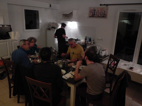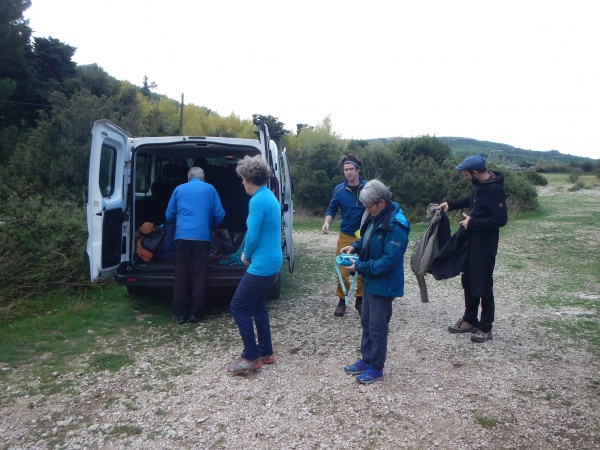 Cette semaine on passait de l'heure d'été à l'heure d'hiver. Il en fut de même pour la météo. En effet les Alpilles n'ont pas échappé aux intempéries nationales. Il a fallu jongler entre les averses, mais heureusement le vent permettait de sécher rapidement le calcaire. Une salle" le Pan d'Avignon" avec une soirée Halloween, une randonnée ont permis de ne pas rester inactif ainsi que la visite des carrières de lumière aux Baux de Provence de se cultiver. Le déplacement s'est effectué avec un trafic loué, 9 places, rallongé. La location hors saison en dur était situé dans un village vacances au centre de Mouriès avec à proximité tous les services et la gestion libre ont rendu ce séjour économique. L'escalade sur les différents sites comme Mouriés ou Eyguières ou Aureille propose un calcaire dont les prises sont teigneuses (pas de bac ou écaille comme chez nous), mais plutôt des pincement, des bidoigts, des gouttes d'eau qui rendaient mains et pieds douloureux en fin de journée. Même Marco TROUSSIER dans un texte sur une page du topo le relève aussi cette caractéristique avec des mots beaucoup plus appropriés. Les difficultés entre le 5 et le 6 nous ont satisfait largement. Les sites ont été rénovés denièrement par convention entre la FFME, les propriétaires et les mairies. Nous sommes allés à Orgon le dernier jour, mais la fraicheur du rocher, l'humidité à proximité du canal, ne nous permettaient pas de tester ce calcaire si particulier (calcaire urgonien). Cela sera pour une prochaine fois. F.PAILLIER